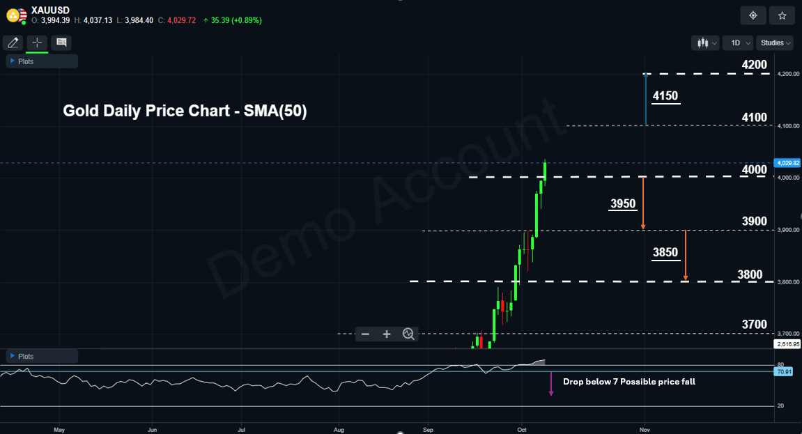 في حال إغلاق سعر الذهب اليومي أدنى مستوى 4000 يدل ذلك على قيام بعض المتداولين بعمليات جني الأرباح، وقد يدفع المزيد من المتداولين للخروج من السوق، بما قد يدفع السعر للمزيد من التراجع نحو مستوى 3900 دولار. في هذه الحالة يتوجب مراقبة مستوى الدعم النفسي الذي يقع عند 3950 دولار. في الوقت الحالي، يوجد مؤشر القوة النسبية في منطقة ذروة الشراء و يعتبر هبوطه لما دون مستوى 70 إشارة على إمكانية تراجع السعر.