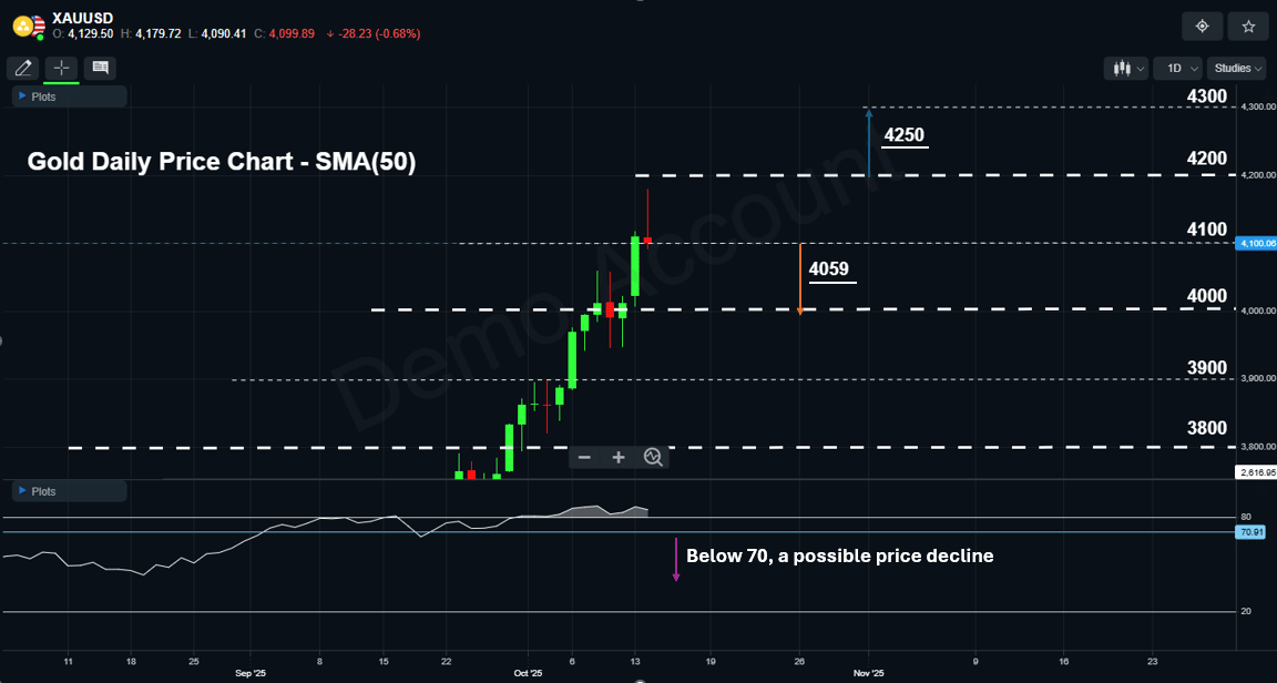 يعتبر الإغلاق اليومي أدنى 4100 إشارة على تراجع زخم الاتجاه الصاعد بسبب خروج بعض المضاربين على ارتفاع الأسعار من السوق لجني الأرباح، بما قد يدفع المزيد من المتداولين للخروج و انضمام المضاربين على تراجع السعر للسوق. في هذه الحالة، قد يتراجع السعر باتجاه مستوى 4000 دولار للأونصة. وقد يفتح الإغلاق اليومي أدنى هذا المستوى المجال أمام المزيد من التراجع باتجاه 3900 دولار للأونصة.