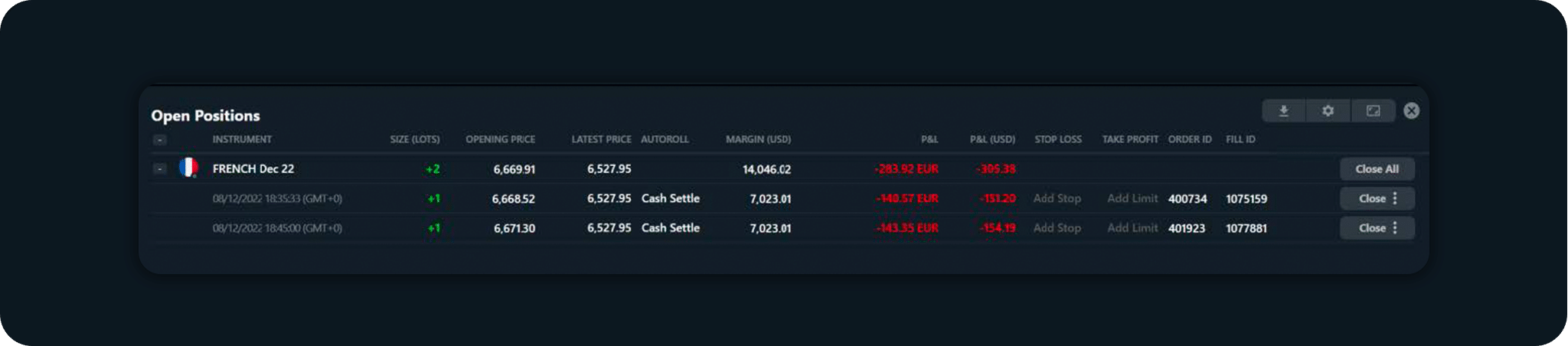 If you have a position in a product made up of a single trade, simply click on ‘Close’ or ‘Close All’ to close the trade.