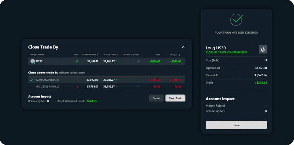 If your position contains both long and short trades, you can choose to close a trade by opening another in the same product with the ‘Close By’ function.