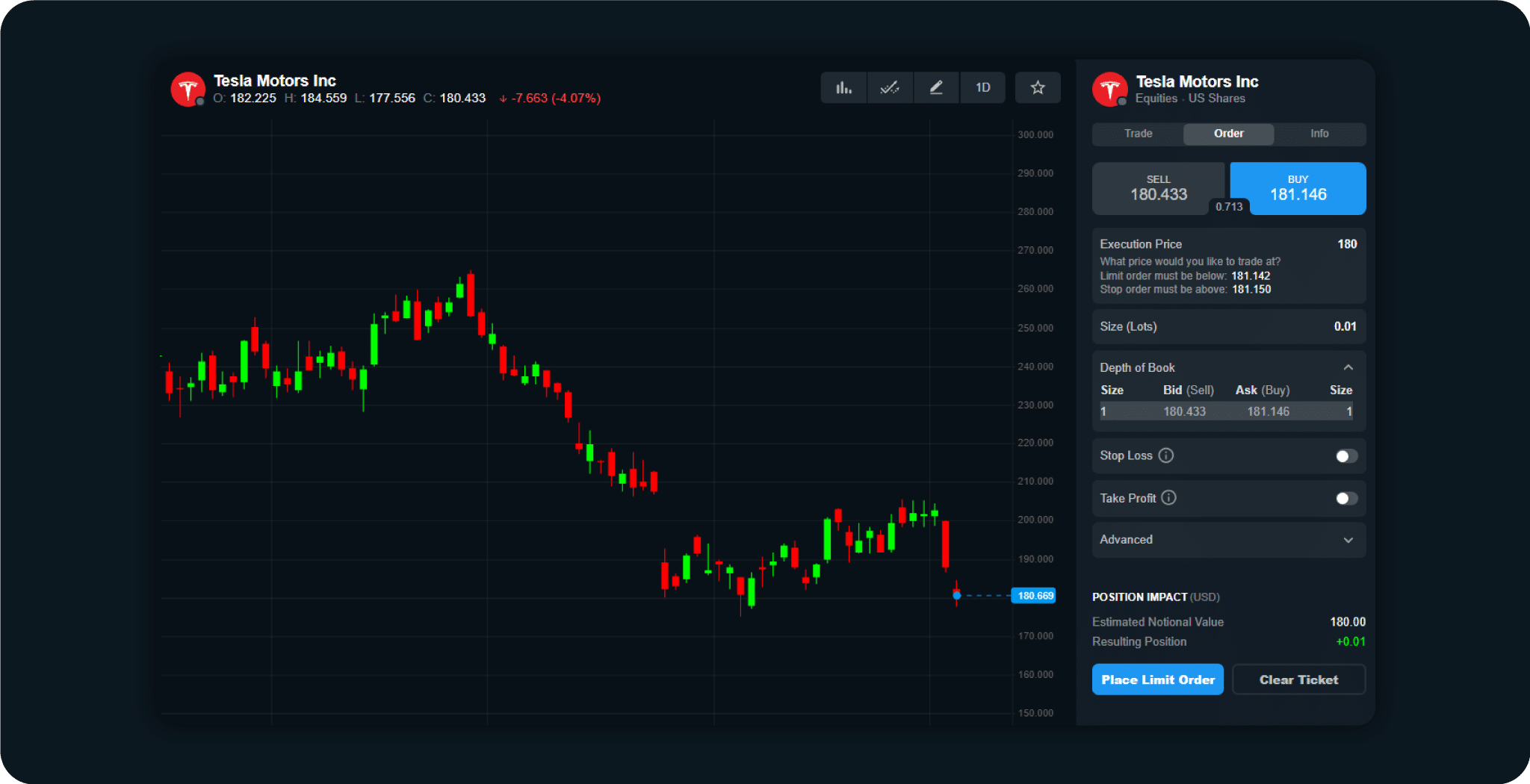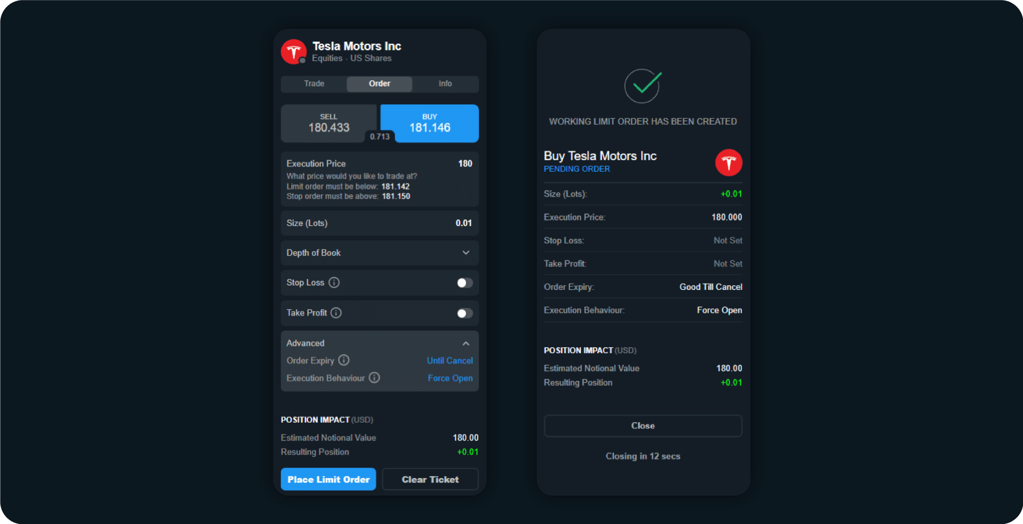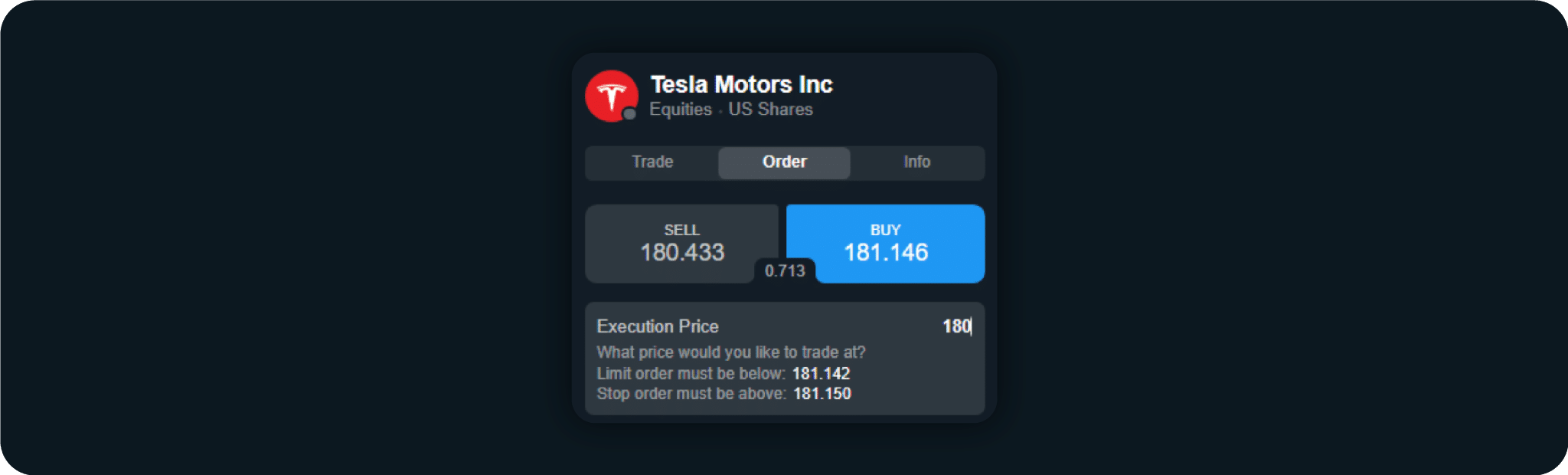 The price you enter determines if your order is a Stop or Limit order, based on the existing Buy or Sell price, and is automatically detected by the platform.