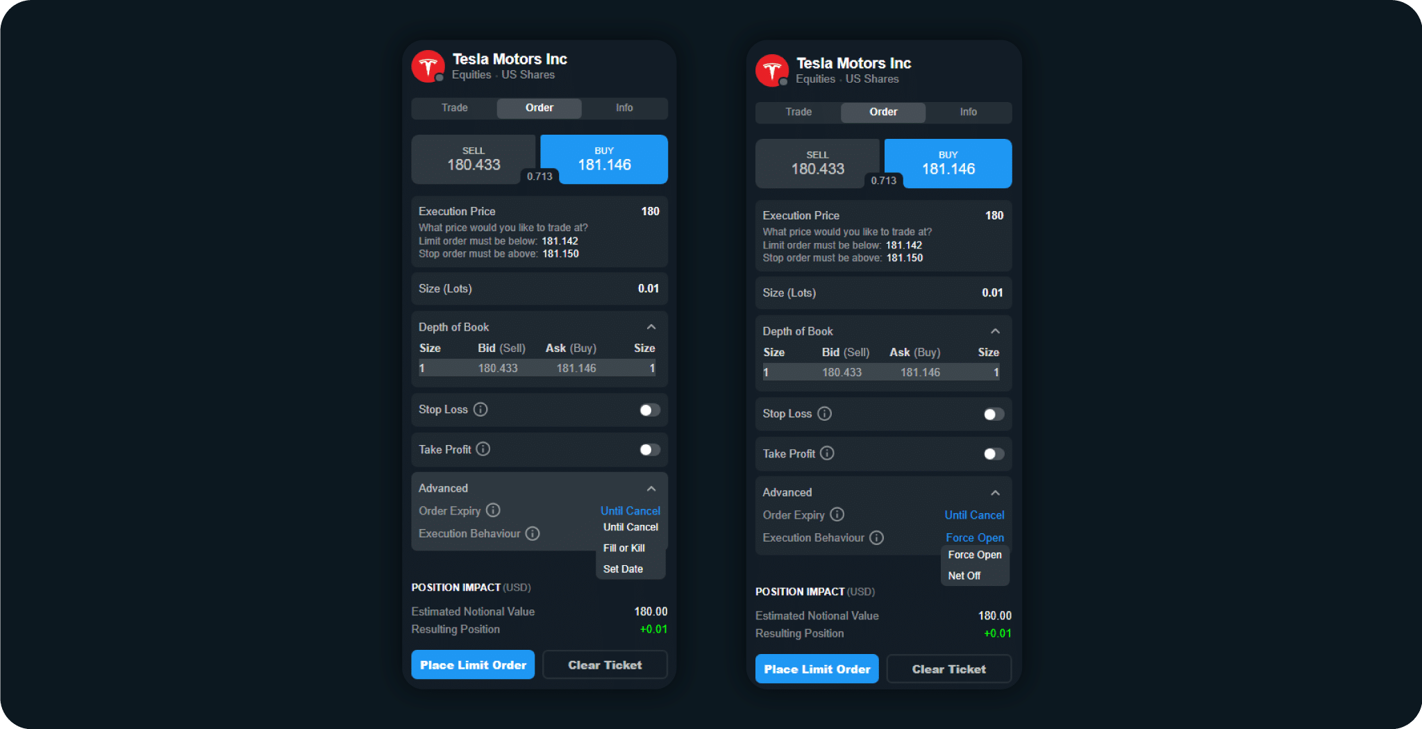 More information on execution behaviour and Net Off or Force Open functions is available in the Execution Behaviour section.