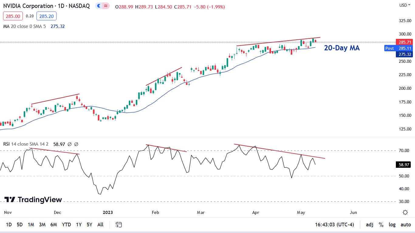 The momentum play is to own the stock if it holds above its 20-day moving average. Since the New Year, higher highs and higher lows have made the strategy immensely profitable. On the other hand, NVIDIA is diverging on the daily chart, as its RSI has made lower highs. The last two times this happened, it preceded drawdowns of 26% and 11%.