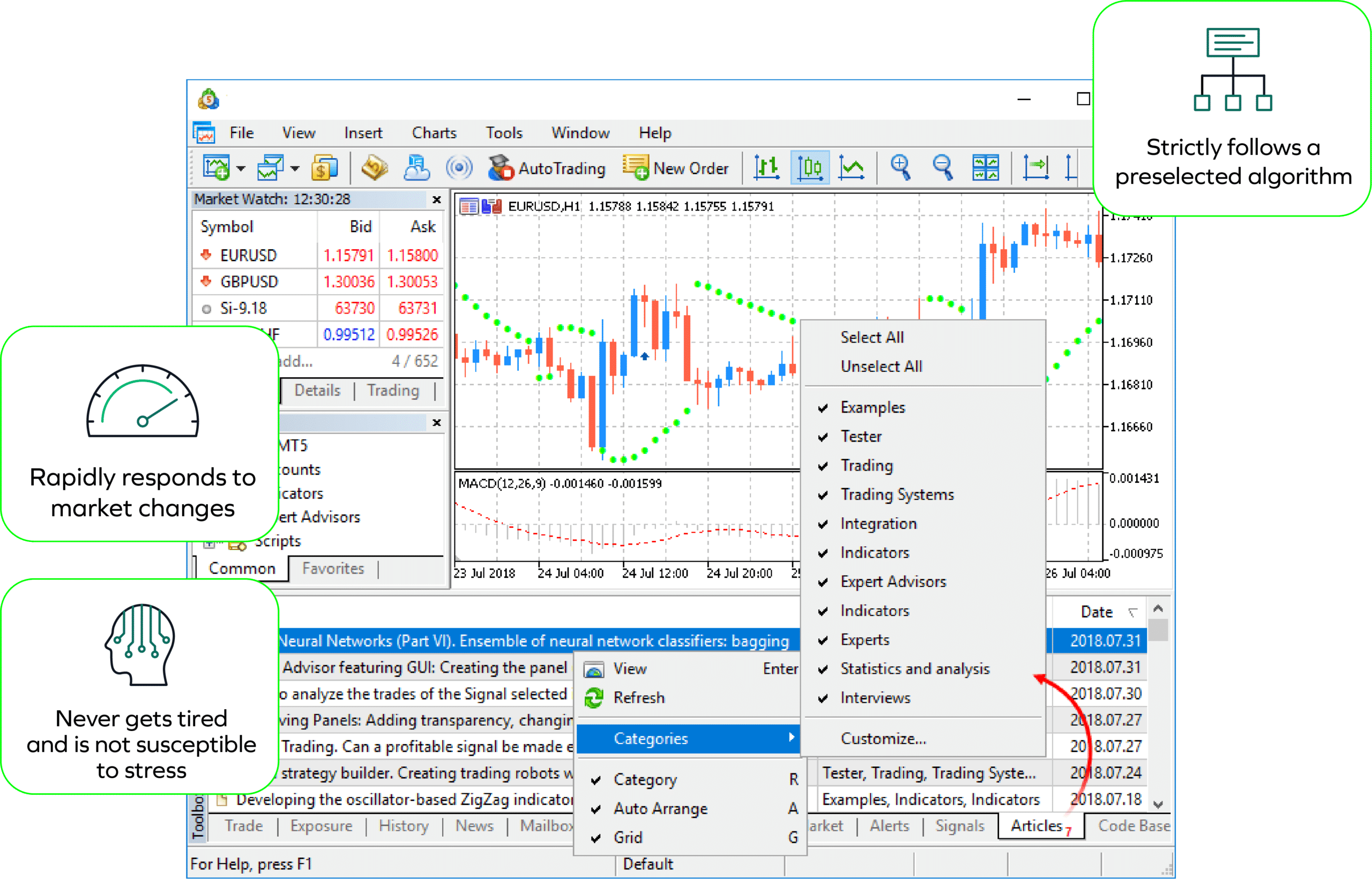MetaTrader allows users to execute live trades using expert advisors according to pre-set rules, a trading style known as algorithmic trading. Using dedicated software such as MT5, it is possible to execute trades automatically at any time and in any market.